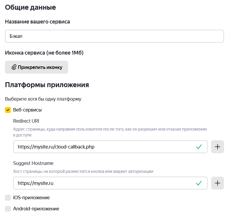https://oauth.yandex.ru/client/new, попадаем на форму регистрации нового приложения. Заполняем поля "Название", выбираем тип платформы "Веб-сервисы" и указываем поля "Suggest Hostname" и "Redirect URI". Два последних поля имеют такой формат: ваш_адрес_сайта иваш_адрес_сайта/cloud-callback.phpсоответственно.