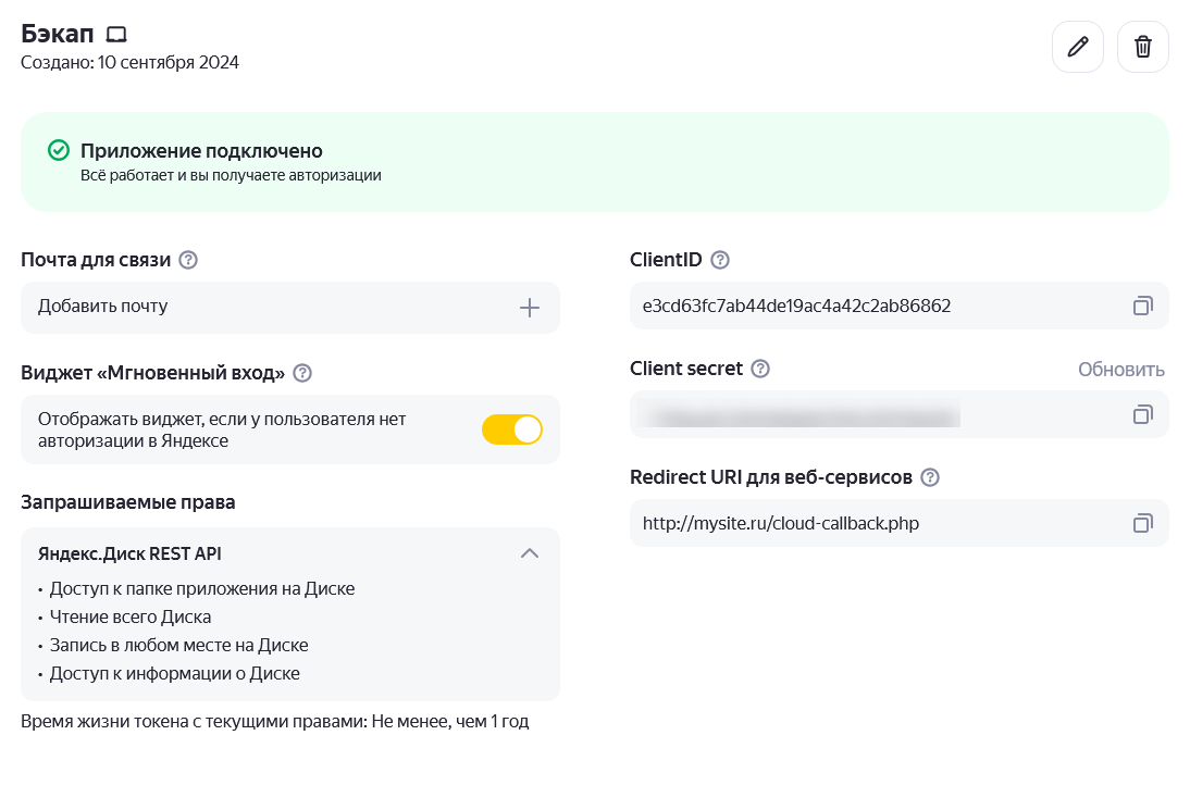 ID и пароль необходимо внести в настройки Яндекс.Диск в модуле "Облачные хранилища". В качестве корневой папки в облаке указываете название созданного приложения. Например, "Бэкап". Саму папку в облаке создавать не нужно, она будет создана в системной папке Яндекс.Диска - "Приложения".