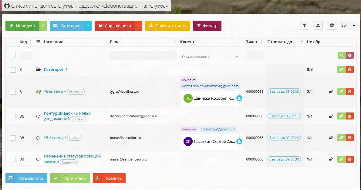 Несколько тикетов можно объединить в один, отметив их и нажав на кнопку Объединить, при этом все объединяемые тикеты группируются в тикет, имеющий наиболее раннюю дату.