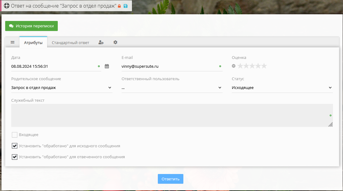 | Установить "обработано" для отвеченного сообщения | Флаг, указывающий, будет ли отвеченное сообщение обработано после нажатия на кнопку «Отправить». |