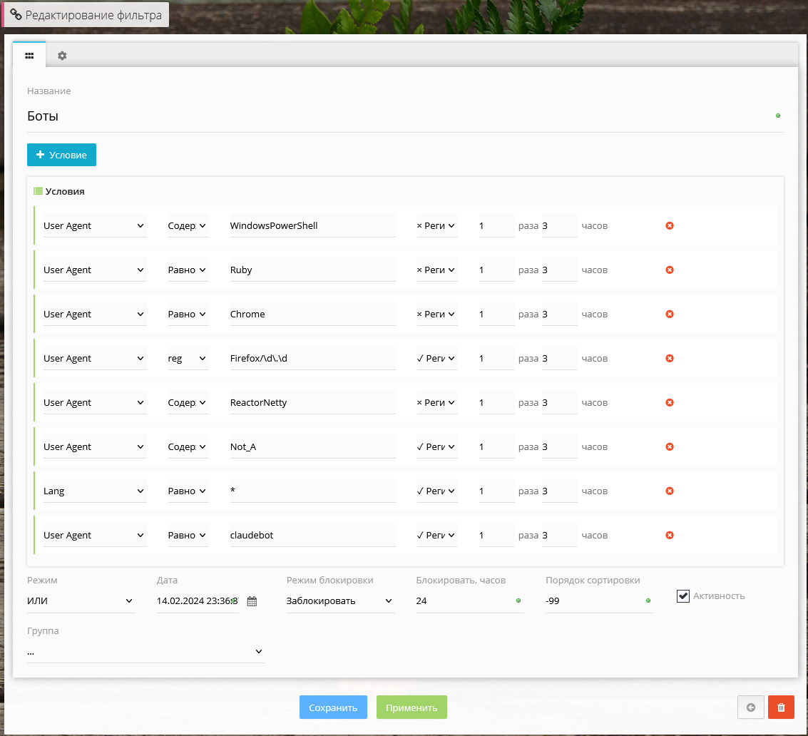 Позволяет заблокировать или вывести страницу с капчей по совпадению различных условий, например User Agent, Referer и т.п. В отличии от фильтров в IP-адресах, анализ происходит как по сессии посетителя, так и по предыдущим посещениям как с этого IP, так и в рамках зарегистрированной сессии.
