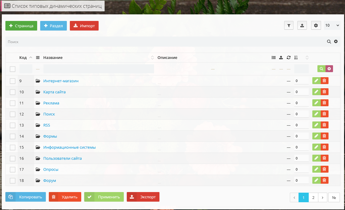 Для управления типовыми динамическими страницами выберите пункт меню Структура сайта → Типовые динамические страницы.