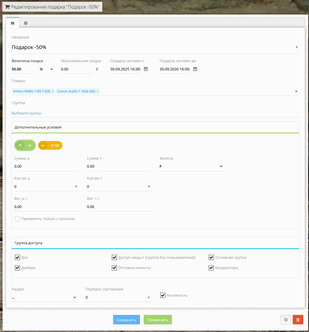 | Группы доступа | скидка может быть доступна всем клиентам или только клиентам из определенных групп, для использования у неавторизованных клиентов должна быть включена опция "Все" |