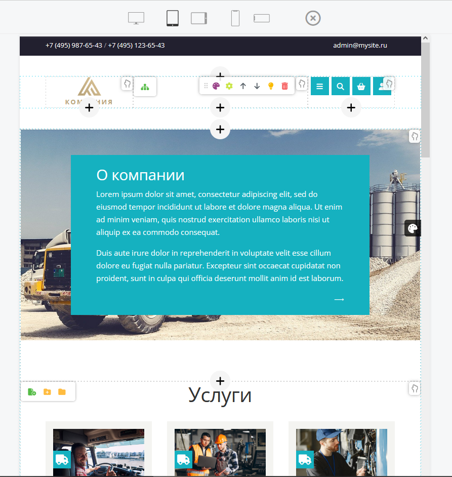 Секции макета предназначены для логического разделения макета на блоки. Внутри секции публикуется виджет из раздела «Типовые динамические страницы», что позволяет из клиентского раздела управлять размещаемыми в секции виджетами, например, перемещать, включать-выключать, задавать опции.