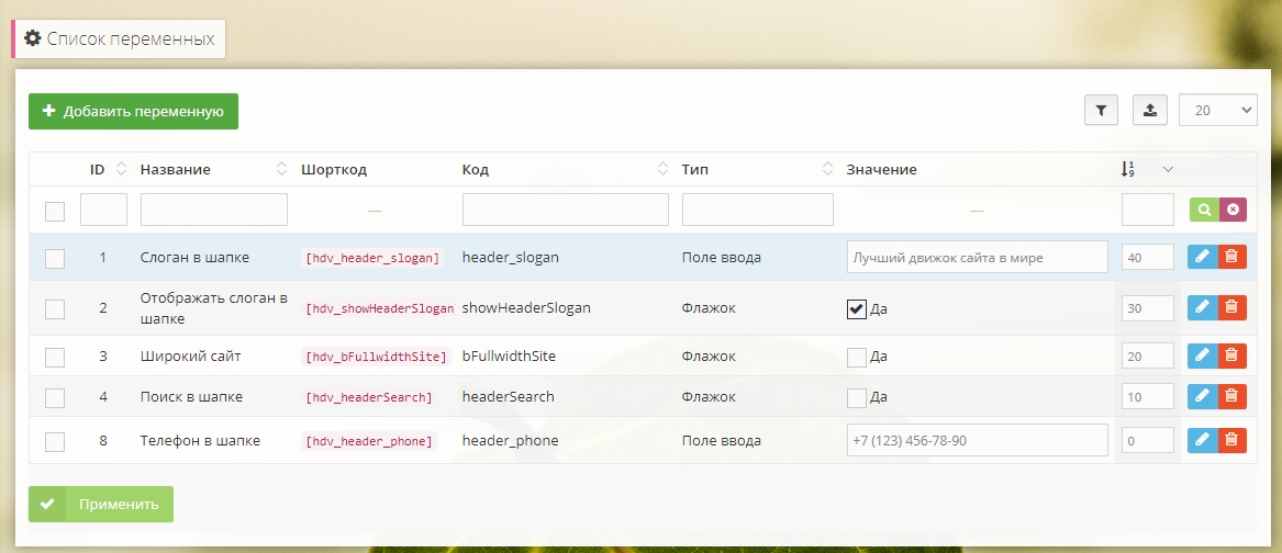 предназначен для расширенного администрирования контента путем вставки шорткодов переменных и вывода их в макеты.