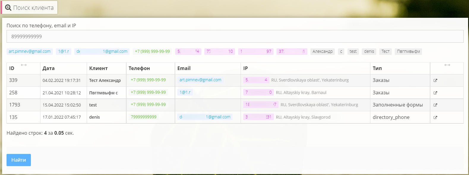 Поиск клиента в центре администрирования по телефону (в любом формате), email и IP по всей базе сайта