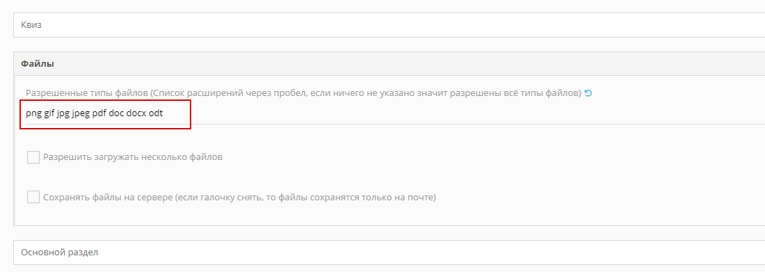 Для поля тип файл есть свои настройки, они применяются только к полям этого типа. Также для поля этого типа можно указать максимальный размер в мегабайтах принимаемых файлов в поле Размер (это поле на одной линии с полем Тип), если размер не указан, он берется из константы AUTO_FORMS_MAX_FILE_SIZE в папке AUTO_FORMS.