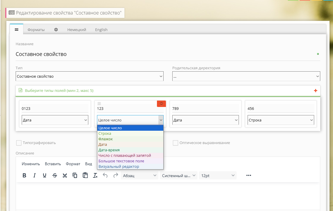 | 1.1 | 10.07.2024 | добавлена сортировка типов свойств добавлен типограф к визуальному редактору исправлена невозможность сохранить значение комплексного свойства если первым типом идет "Флажок" и он не установлен | 7.0.2 | ∞ |