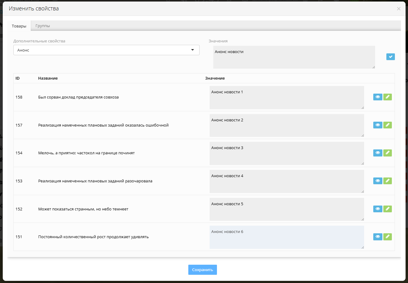Модуль добавляет кнопку массового изменения дополнительных свойств в список инфоэлементов. Можно сразу для группы элементов применить допсвойство типа список, или руками в табличном виде по одному проставить значения ориентируясь на названия.