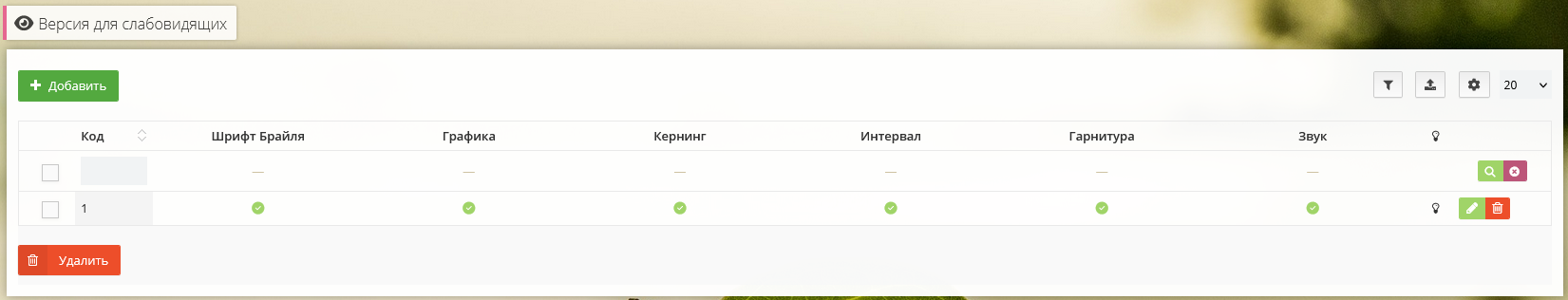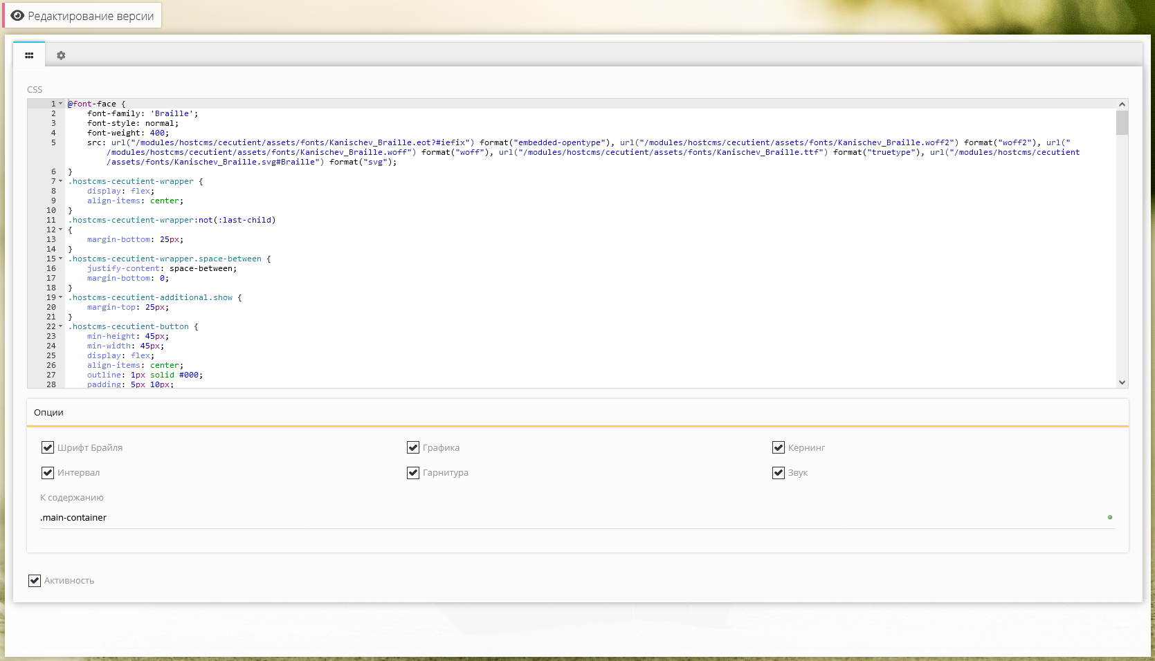 При необходимости изменения внешнего вида или опций режима для слабовидящих необходимо отредактировать стили, расположенные при редактировании требуемой версии в центре администрирования.