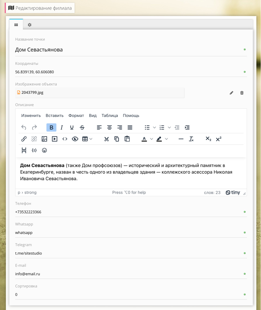 - Контакты: телефон, email, whatsapp, telegram.