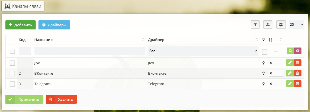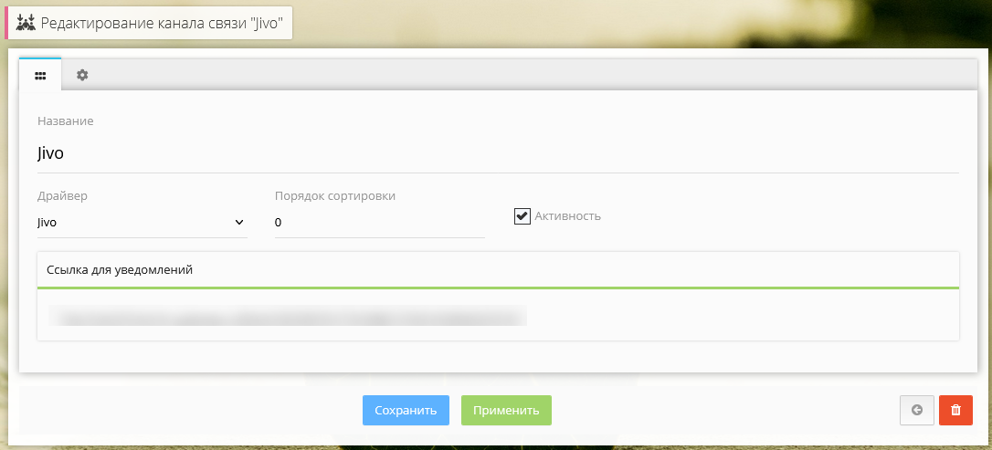 - Создаем канал связи в модуле с драйвером Jivo и сохраняем.