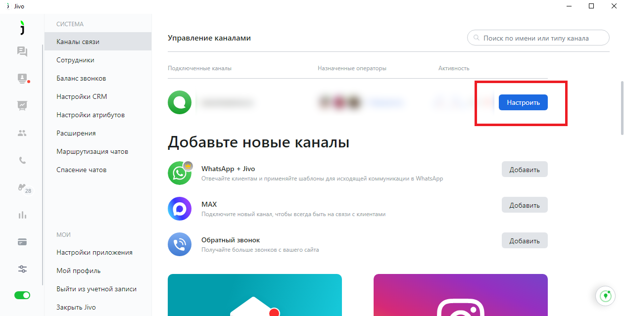 - Далее в настройках Jivo перейдите в панель управления Jivo → Каналы связи.