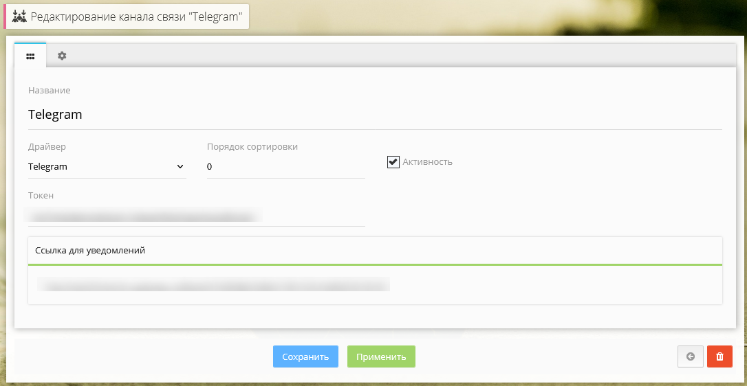 - Создаем канал связи в модуле с драйвером Telegram. В поле Токен копируем токен, полученный на шаге 1, и сохраняем.