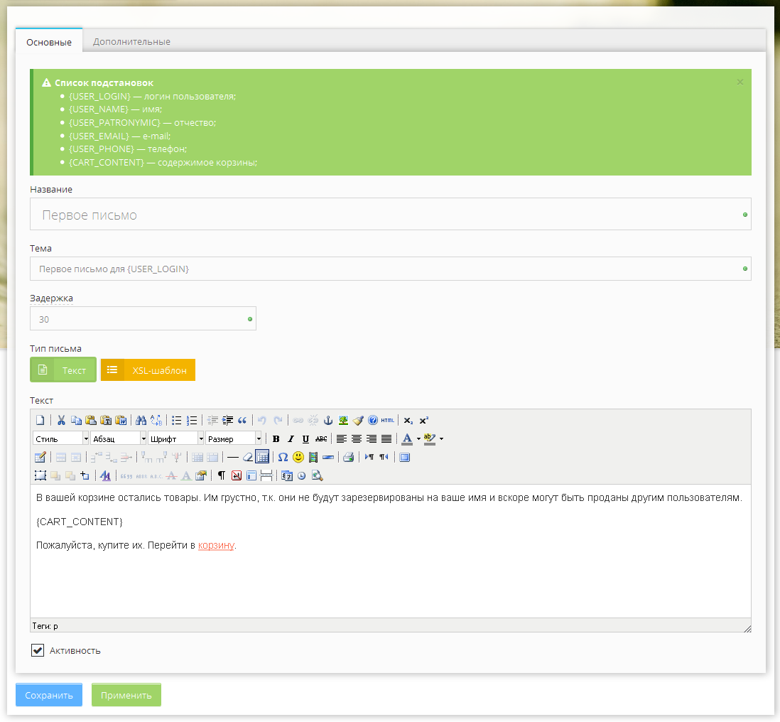- Задержка — Задержка (в минутах) отправки письма пользователю сайта, при отсутствии активности. Например, 05.12.2016 в 12:00 пользователь добавил товар в корзину. При отсутствии активности в корзине, т.е. пользователь не удалял или добавлял в корзину товары, 05.12.2016 в 12:30 ему будет отправлено письмо о забытой корзине. Время отсчитывается с момента последней активности пользователя в корзине на сайте.