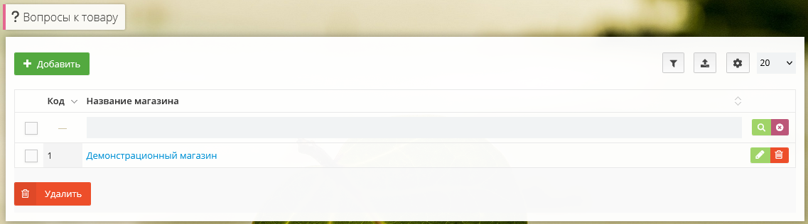 Перейдите в раздел Вопросы к товарам, вопросы можно добавить для каждого магазина, если для всех магазинов вопросы добавлены, кнопка Добавить будет отсутствовать.